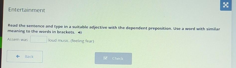 Read the sentence and type in a suitable adjective with the dependent preposition. Use a word with similar meaning to the words in brackets.