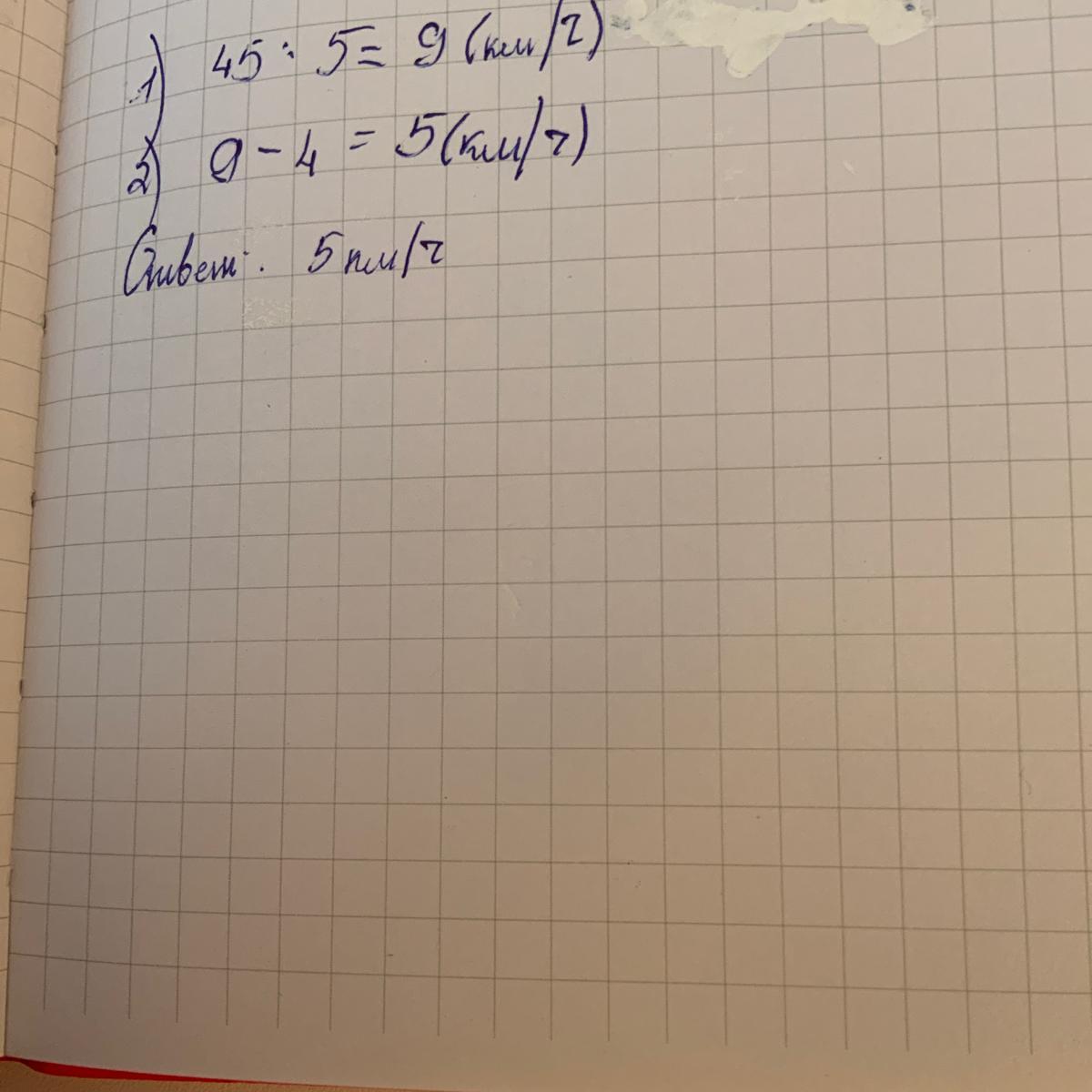 Из двух горных аулов, расстояние между которыми 45 км, одновременно навстречу друг другу выехали два путешественника. Один ехал на осле со скоростью 4 км/ч, а другой на муле. Через 5 ч они встретились. Найди скорость, с которой двигался путешественник на муле.