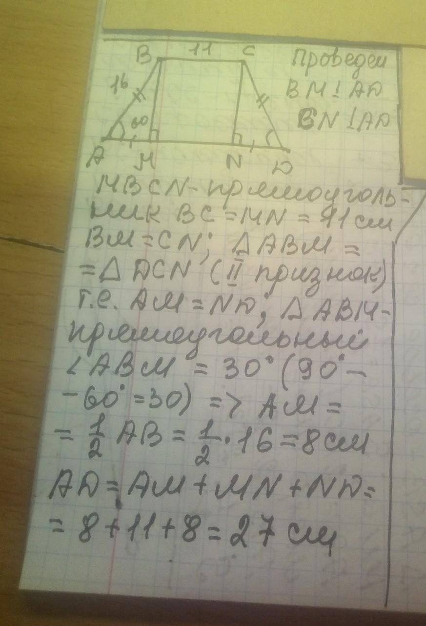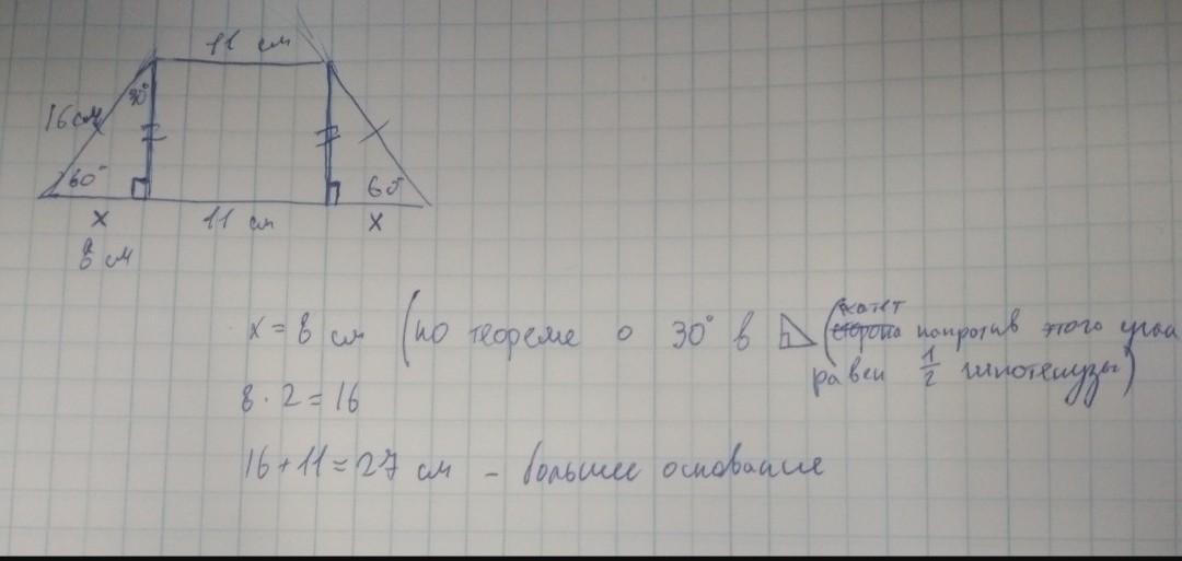 В равнобедренной трапеции один из острых углов равен 60 градусов,длина боковой стороны 16 см.Найти большее основание,если меньшее 11 см.