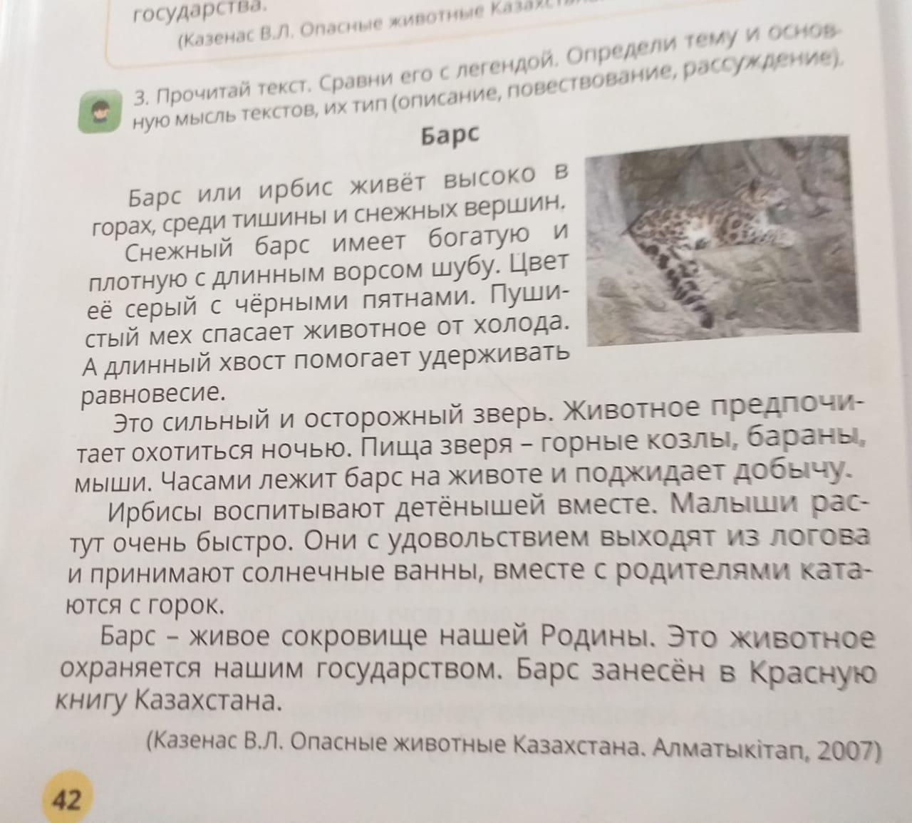 Барс живёт высоко в горах. Его мех теплый, серый с черными круглыми пятнами. Он предпочитает охотиться ночью. Его добыча это горные козлы и бараны. Детёныши барса растут быстро, так же они не против порезвиться с родителями. Барс - это благородное животное занесённое в красную книгу Казахстана.