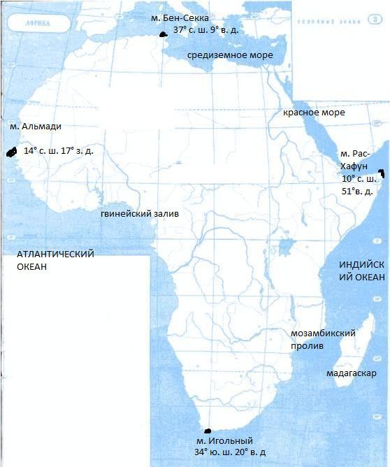 На контурную карту Африки нанести: