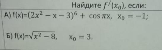 1)f'(x) = 6 {(2 {x}^{2}  - x - 3)}^{5}  \times (4x - 1) - \pi \sin( \pi \: x )  \\ f'( - 1) = 6( - 4 - 1) {(2 + 1 - 3)}^{5}  - \pi \sin( - \pi)  = 6 \times ( - 5) \times 0 - 0 = 0
