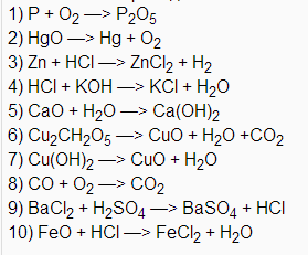 1)соединения 2)разложения 3)замещения 4)обмена(нейтрализации) 5)соединения 6)разложения 7)разложения 8)соединения 9)обмена 10)обмена