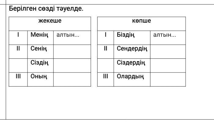 Жекеше: менің алтыным сенің алтынын сіздің алтыныңыз оның алтыны көпше:біздің алтынымыз сендердің алтындарың сіздердің алтындарыңыз олардың алтындары
