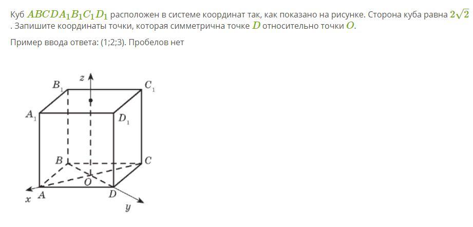 Куб ABCDA1B1C1D1 расположен в системе координат так, как показано на рисунке. Сторона куба равна 22–√ . Запишите координаты точки, которая симметрична точке D относительно точки O.