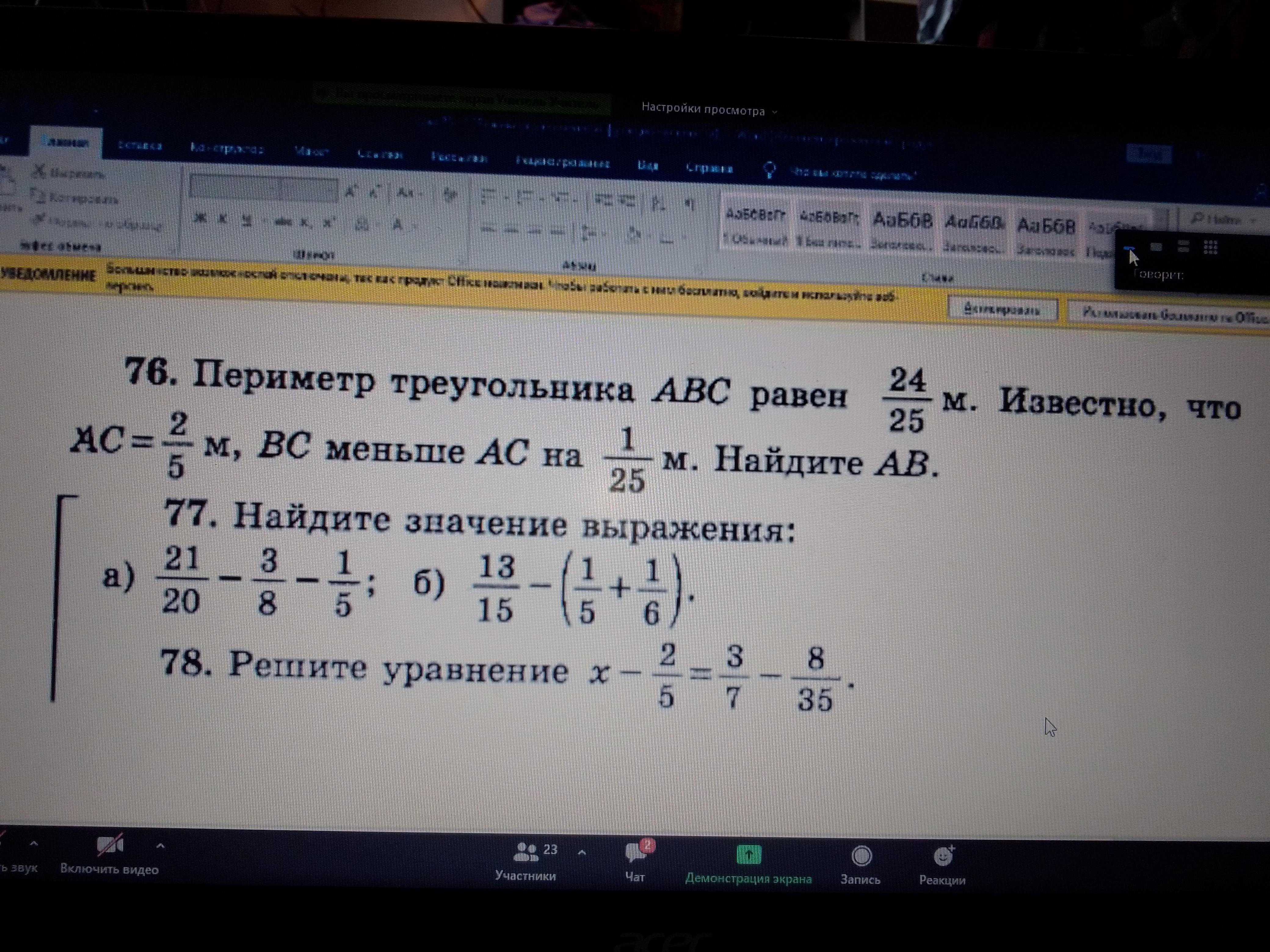 76. 5/25 м. 77. а) 19/40. б) 15/30. 78. х=21/35.