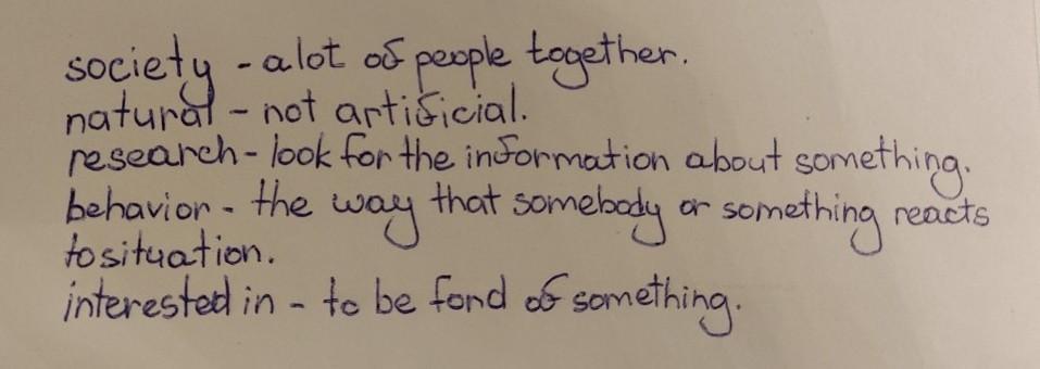 Ответ: society - a lot of people together, research - look for the information about something, interested in - to be fond of something, behavior - the way something or someone reacts to the situation, natural - not artifical