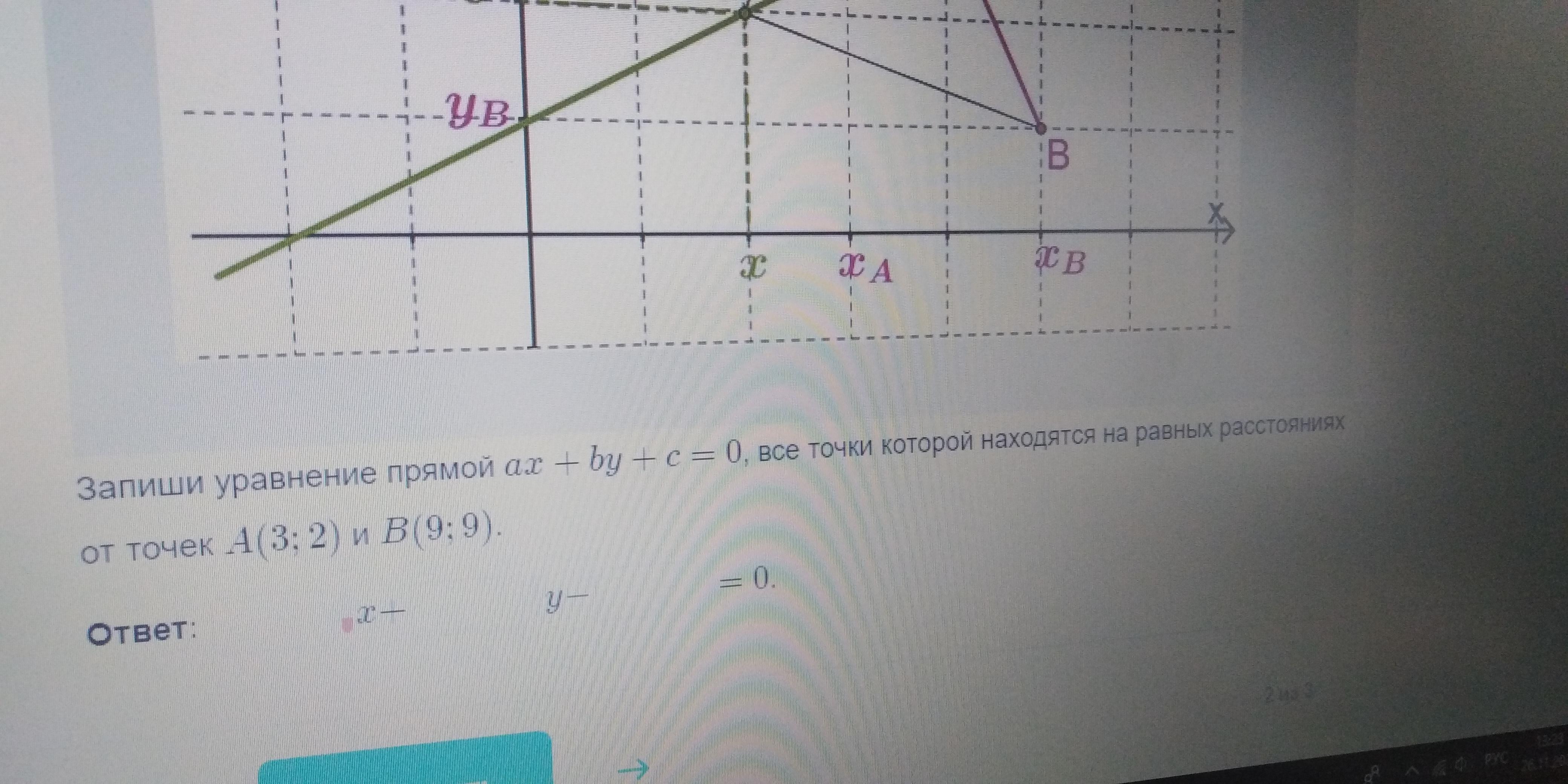 Запишите уравнение прямой ax+by+c=0 все-таки в которые находятся на равных расстояниях от точкиA(3;2) и B (9;9)