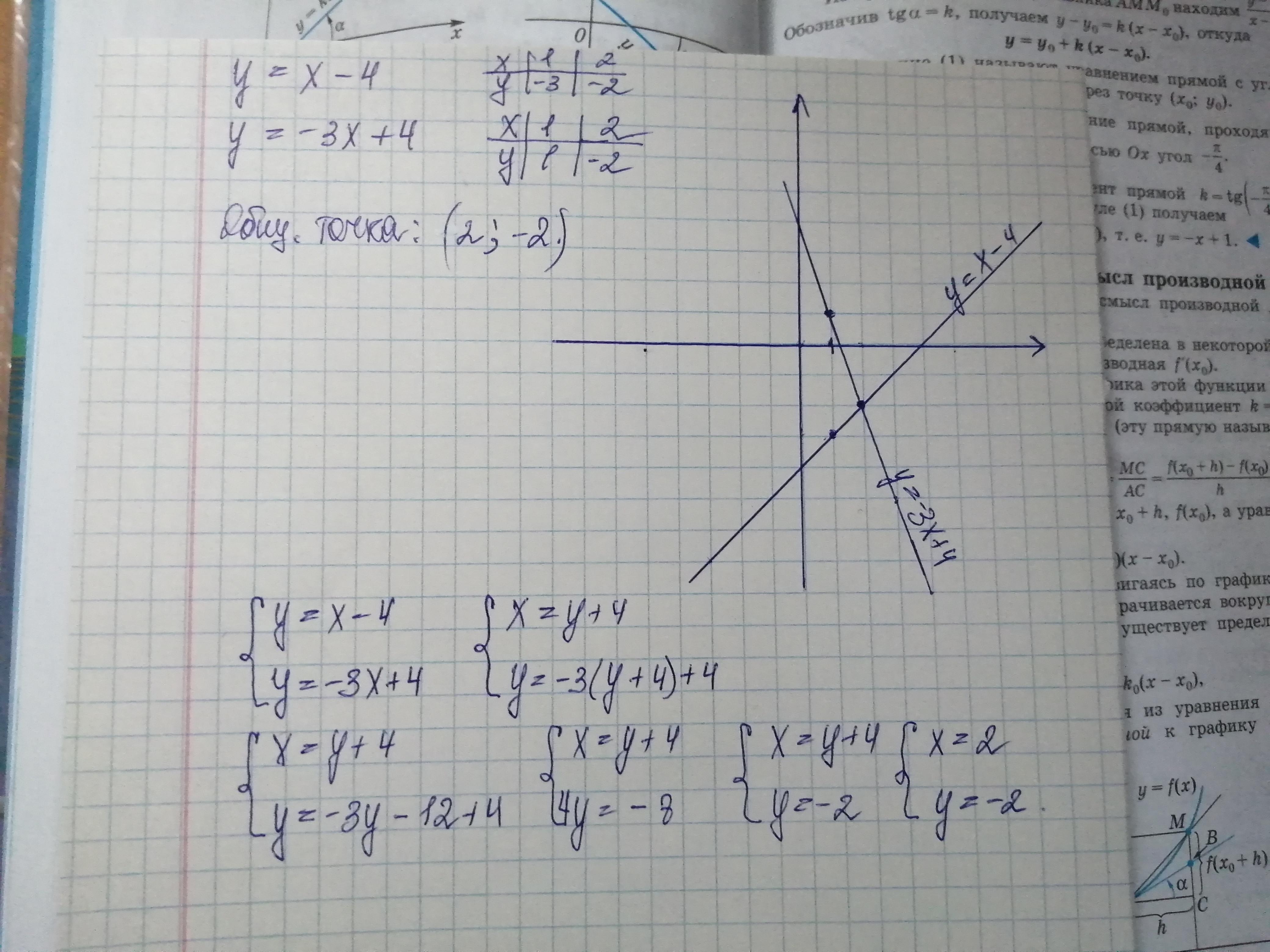 определите двумя способами, в какой точке пересекаются графики функций у= х - 4 и у= - 3х + 4 (географический и алгебраический способ)