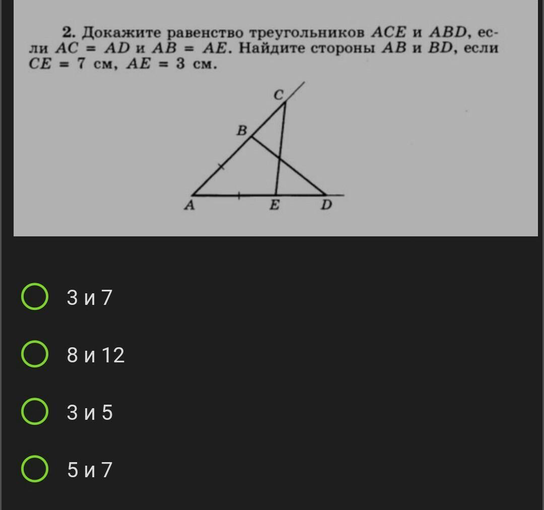Треугольники равны по двум сторонам и углу между ними. АВ=АЕ, АС=АД. Угол А общий