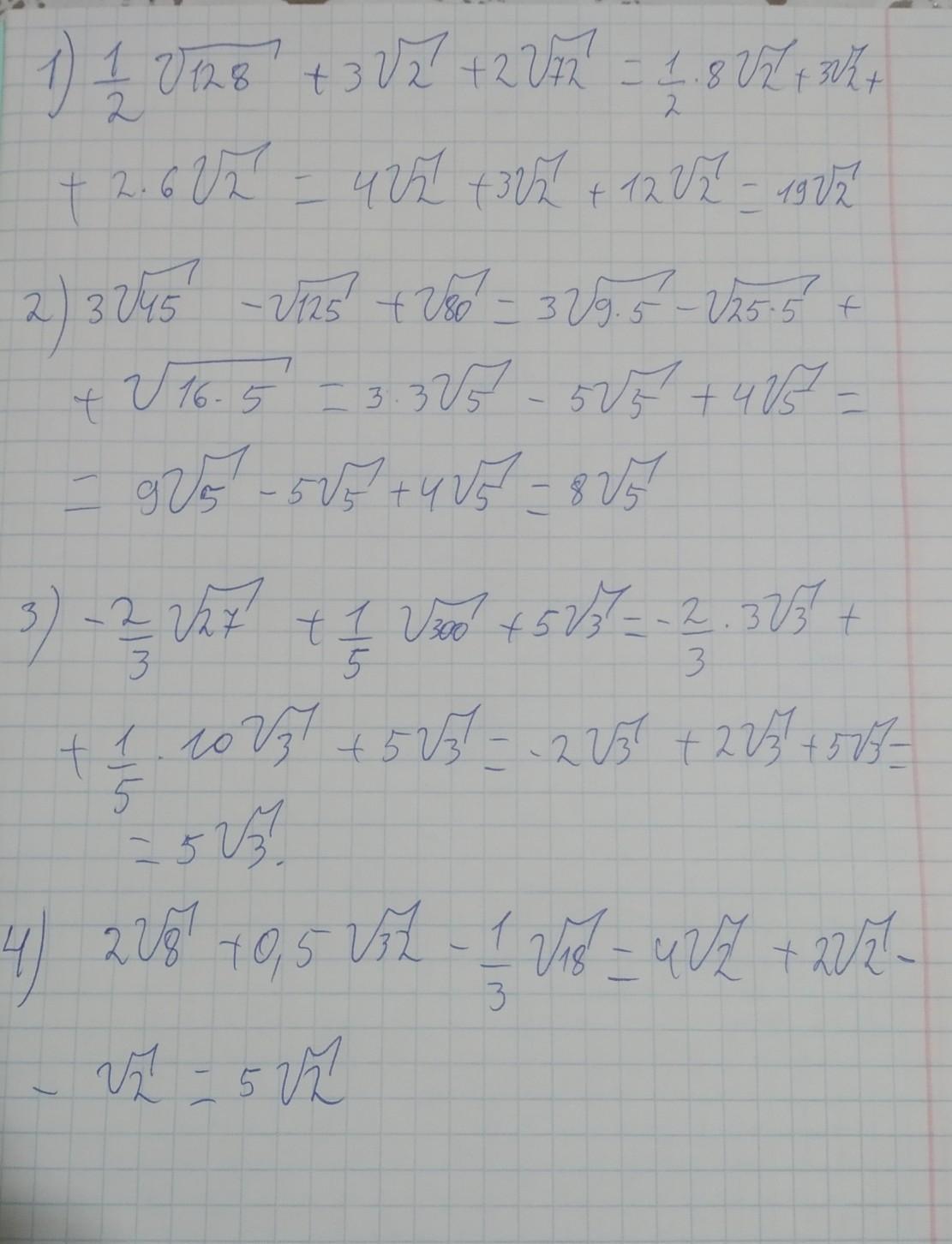 разлагаем подкоренное выражение на сножители и выносим один множитель за знак корня так, чтобы подкоренное выражение в примере было одинаковым. дальше выполняем обычные арифметические действия