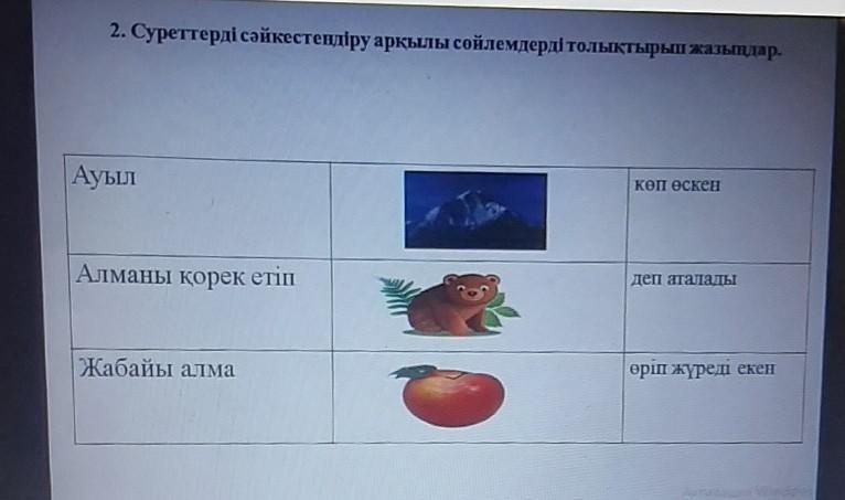 2. Суреттерді сәйкестендіру арқылы сөйлемдерді толықтырып жазыңдар.