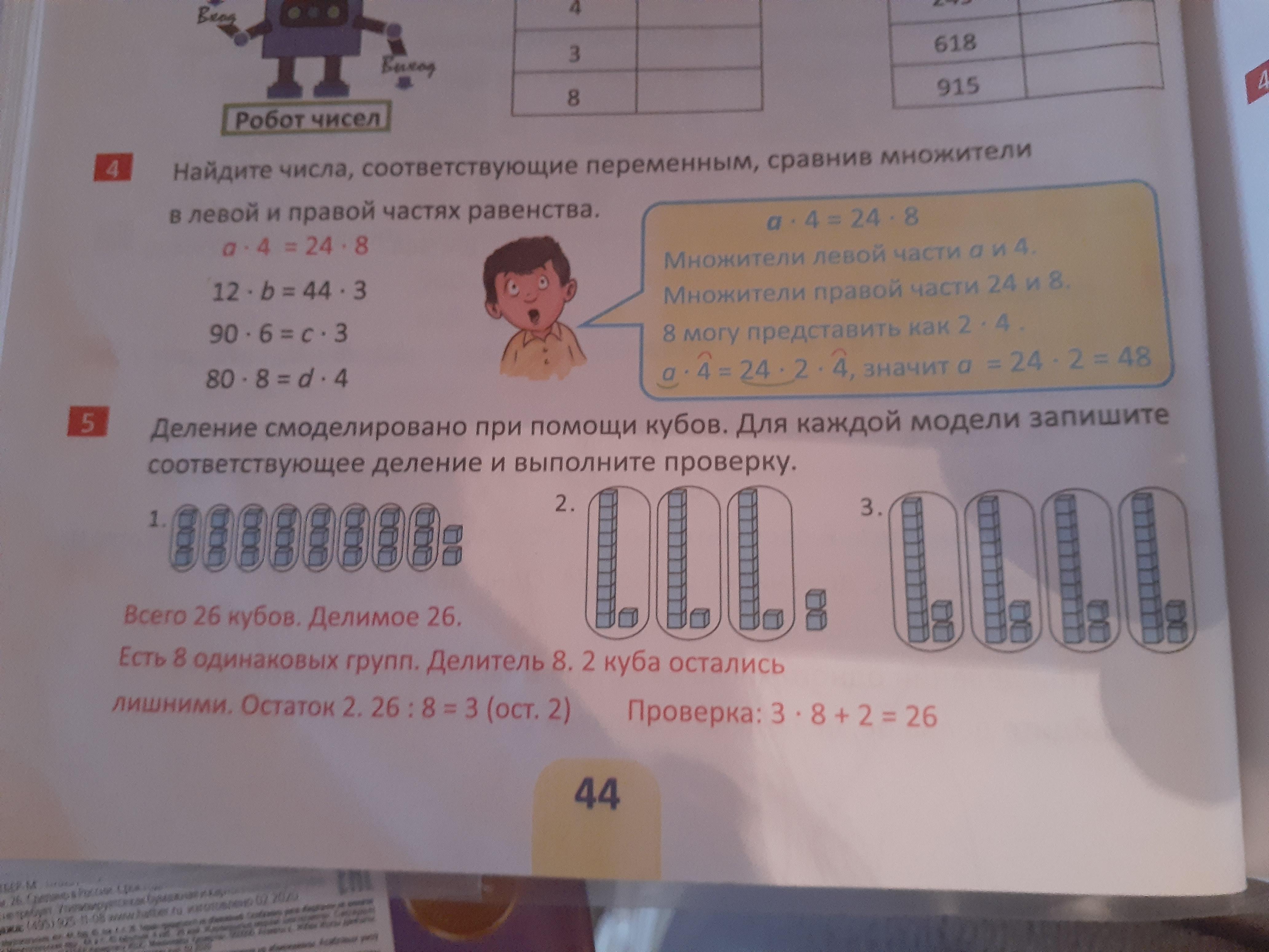 Есть 3 одинаковые группы. Делитель 3. Два куба остались лишними. Остаток 2.