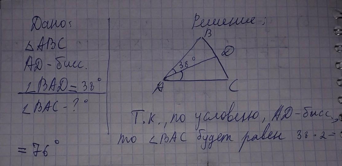 Чему равен угол ВАС, если АД - биссектриса треугольника ABC, а угол ВАД равен 38 градусов?