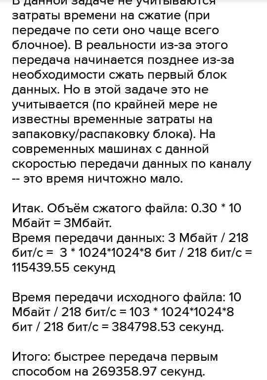 Документ объёмом 16 Мбайт можно передать с одного компьютера на другой двумя способами :А) сжать архиватором, передать архив по каналу связи, распаковать; Б) передать по каналу связи без использования архиватора. Какой способ быстрее и насколько, если• средняя скорость передачи данных по каналу связи составляет 2 в 24 бит в секунду,• объём сжатого архиватором документа равен 12,5% от исходного,• время, требуемое на сжатие документа, 14 секунд, на распаковку – 6 секунд? В ответе напишите букву А, если способ А быстрее, или Б, если быстрее способ Б. Сразу после буквы напишите на сколько секунд один способ быстрее другого. Так, например, если способ Б быстрее способа А на 23 секунды, в ответе нужно написать Б23.Слова «секунд», «сек.», «с.» к ответу добавлять не нужно. *