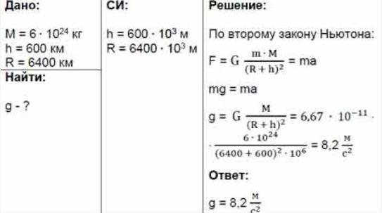 чему равно ускорение свободного падения на высоте 1600 км от поверхности земли. масса земли равна 6*10^24 кг, радиус земли равен 6400 км