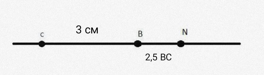 На прямой даны две точки C и B, находящиеся на расстоянии 3 см друг от друга. Если на продолжении луча BC отложить отрезок BN равный 2,5 BC. Какова будет длина отрезка BN?