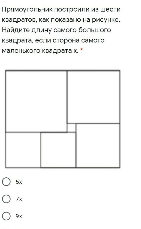 Прямоугольник построили из шести квадратов, как показано на рисунке. Найдите длину самого большого квадрата, если сторона самого маленького квадрата x. *