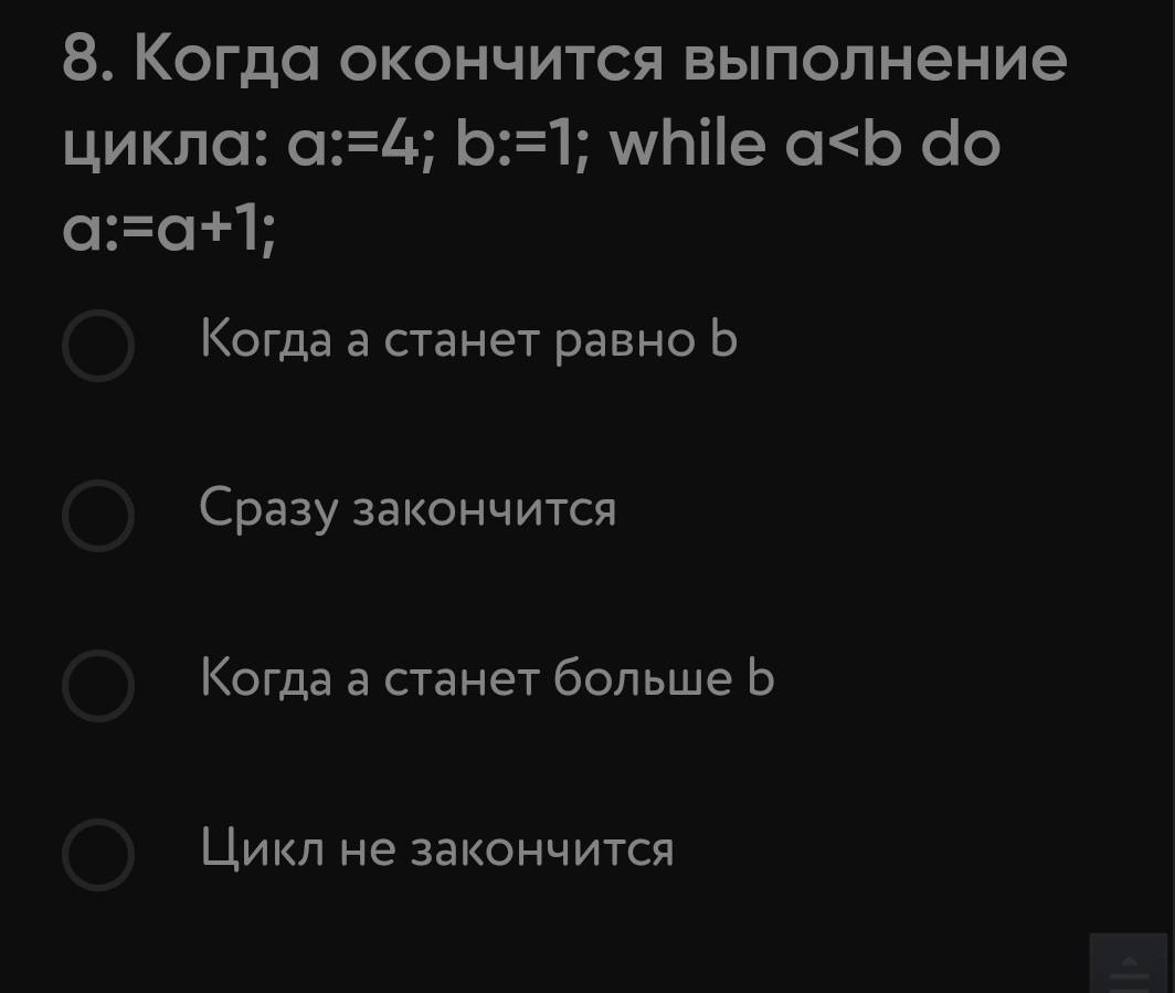 Цикл закончится при условии a<b. В начале цикла это условие не выполняется, т.к. a=4 и b=1 (a>b). При следующем цикле, к оператору a прибавляется 1, то есть a=5 и b=1 (условие опять же не выполняется - a>b). Цикл закончится в тот момент, когда b будет больше a. Но этого не случится, т.к в теле цикла нет условия при котором оператор b может стать больше a