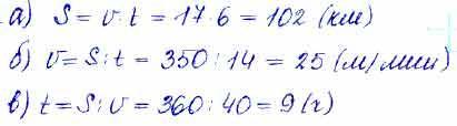 Формула s=v*t а) путь S, если v=17км/ч, t=6 ч б) скорость v , если S =350м, t=14 мин в) время t, если S =360км, v=40 км/ч
