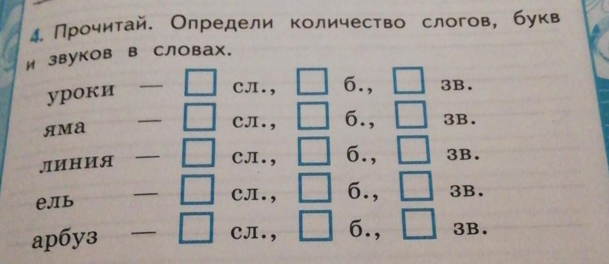 Прочитай. Определи количество слогов, букв и звуков в словах