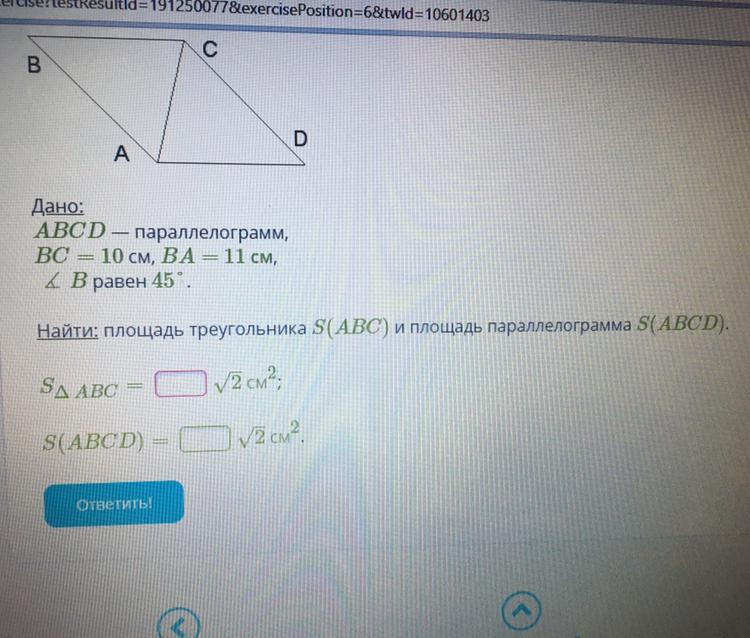 Дано:ABCD-параллелограмм, ВС=10 см, ВА=11 см, L B равен 45°