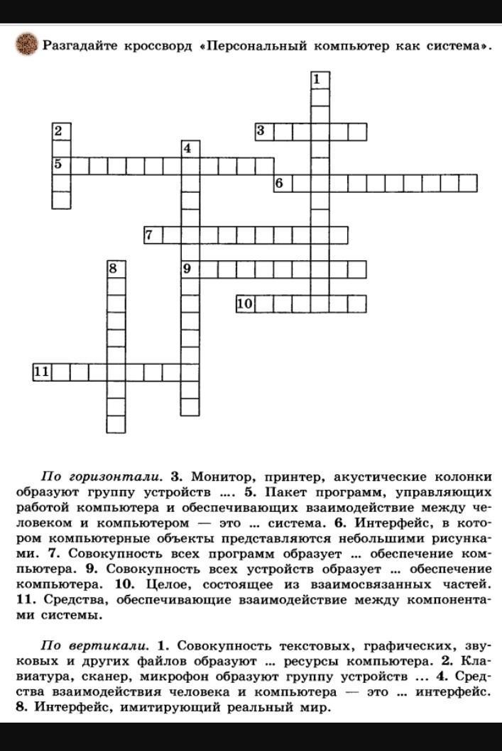 По горизонтали. 3. Вывода, 5. Операционная. 6. Графический. 7. Программное. 9. Аппаратное. 10. Система. 11. Интерфейс.
