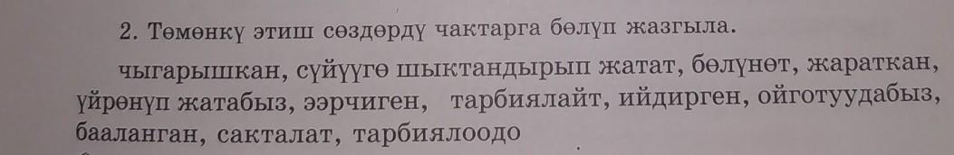 төмөнкү этиш сөздөрдү чактаргы бөлүп жазгыла