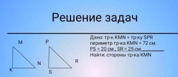 Дано:тр-к KMN = тр-ку SPR периметр тр-ка KMN = 72 см.