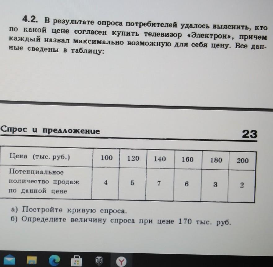 100 б дам СРОЧНО ЭКОНИМИКА ребята прошу помогите! экономика, в результате спроса потребителей удалось выяснить кто по какой цене согласен купить телевизор Электрон причём каждый назло максимально возможную для себя цену все данные сведены в таблицу постройте кривые спроса определить величину спроса при цене 170000 руб