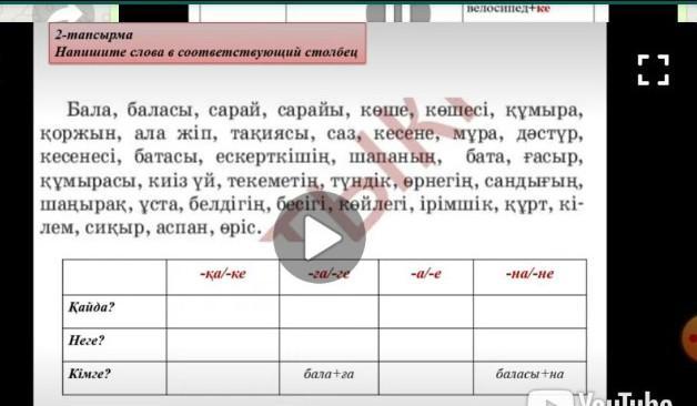 Ответ: Қайда? 1)Сарайға,сарайына; 2)көшеге, көшесіне; 3)сазға; 4)кесенеге; 5)ескерткішке; 6)киіз үйіне; 7)өріске; 8)аспанға;
