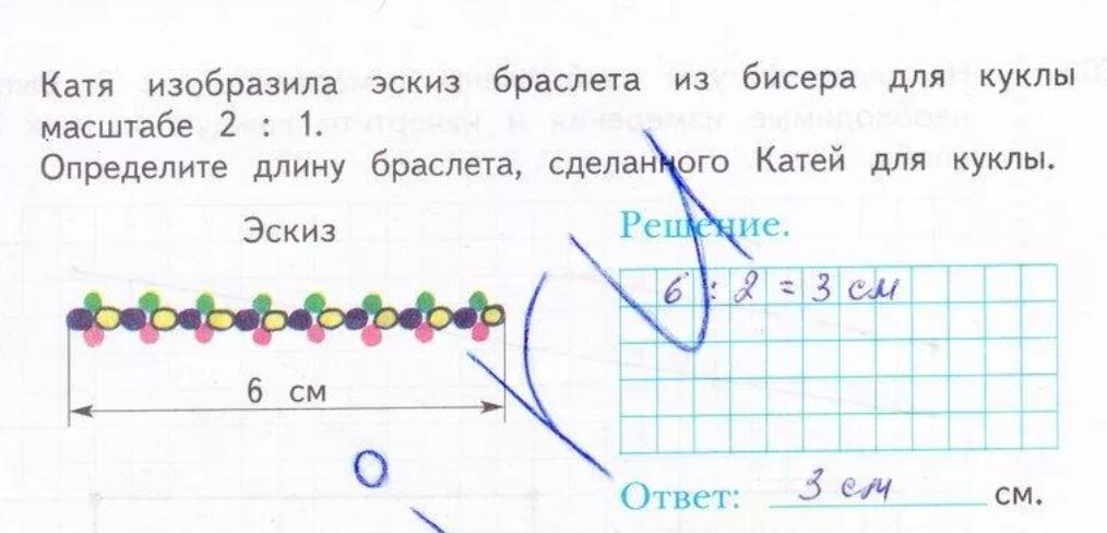 Ну смотри, масштаб 2:1 это значит, что на рисунке браслет в 2 раза больше (длина равна 6). Чтобы найти реальную длину браслета нам нужно 6:2 получаем 3см, это и будет длинной браслета.