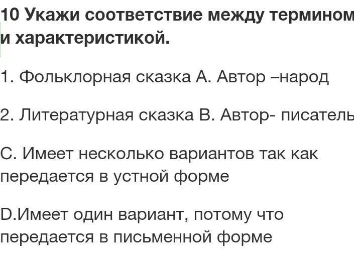 2) Литературная сказка - автор писатель - создавалась одним человеком (либо несколькими, но явно меньшим количеством, чем фольклорная), при этом записывалась. А, как известно, написанного пером - не вырубишь топором. Поэтому имеет один вариант - D