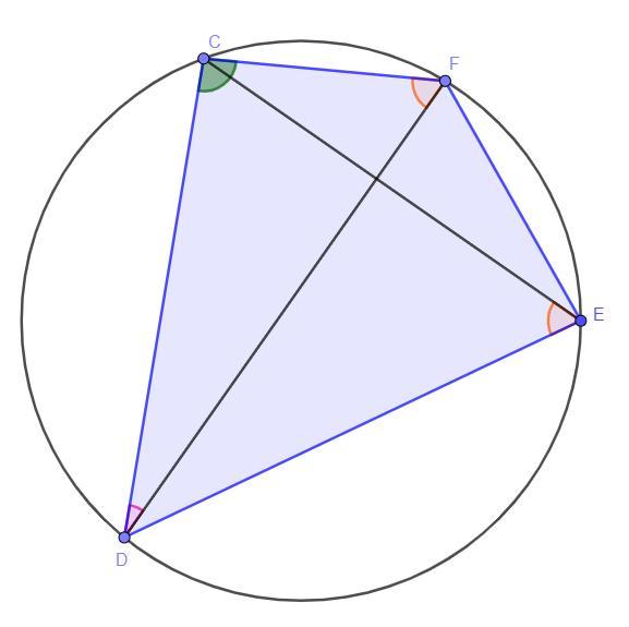 Розв'язання: За теоремою кути які спираються на одну й ту саму хорду рівні. Так як кут ∠DEC спирається на дугу ∪DC і кут ∠DFC спирається на дугу ∪DC, то кут ∠DEC = ∠DFC = 30°. Розглянемо трикутник ΔDFC. За теоремою про суму кутів трикутника: ∠DFC + ∠CDF + ∠DCF = 180° ⇒