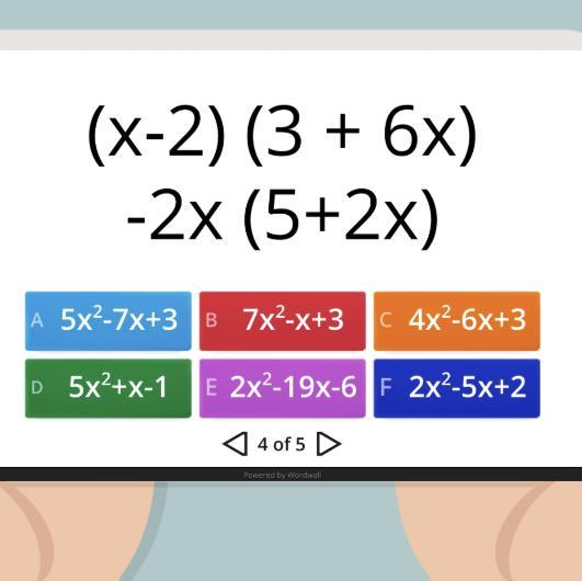 (x-2) (3+6x) -2x(5+2x) = 3x + 6x^2 - 6 - 12x - 10x - 4x^2 = 2x^2 - 19x - 6