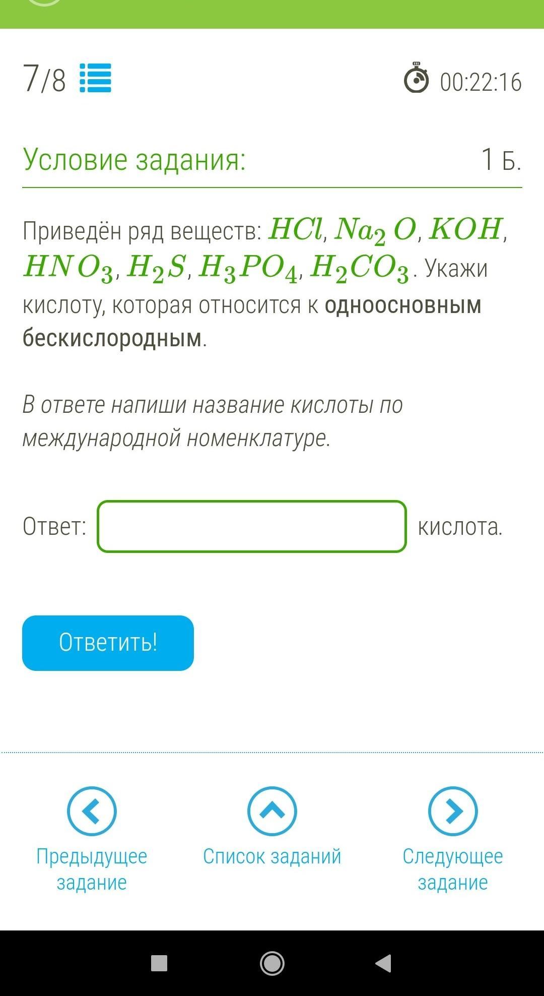 Приведён ряд веществ: HCl, Na2O, KOH, HNO3, H2S, H3PO4, H2CO3. Укажи кислоту, которая относится к одноосновным бескислородным.