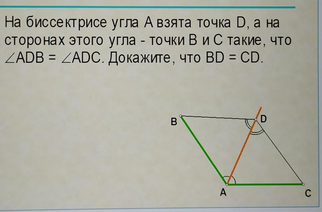 BD=CD, т.к. треугольники ADB и ADC равны по 2 признаку равенства треугольников ( по стороне и двум прилежащим к ним углам : AD-общая, уголADB=ADC-по условию, угол BAD=CAD, т.к. AD-биссектриса. Все