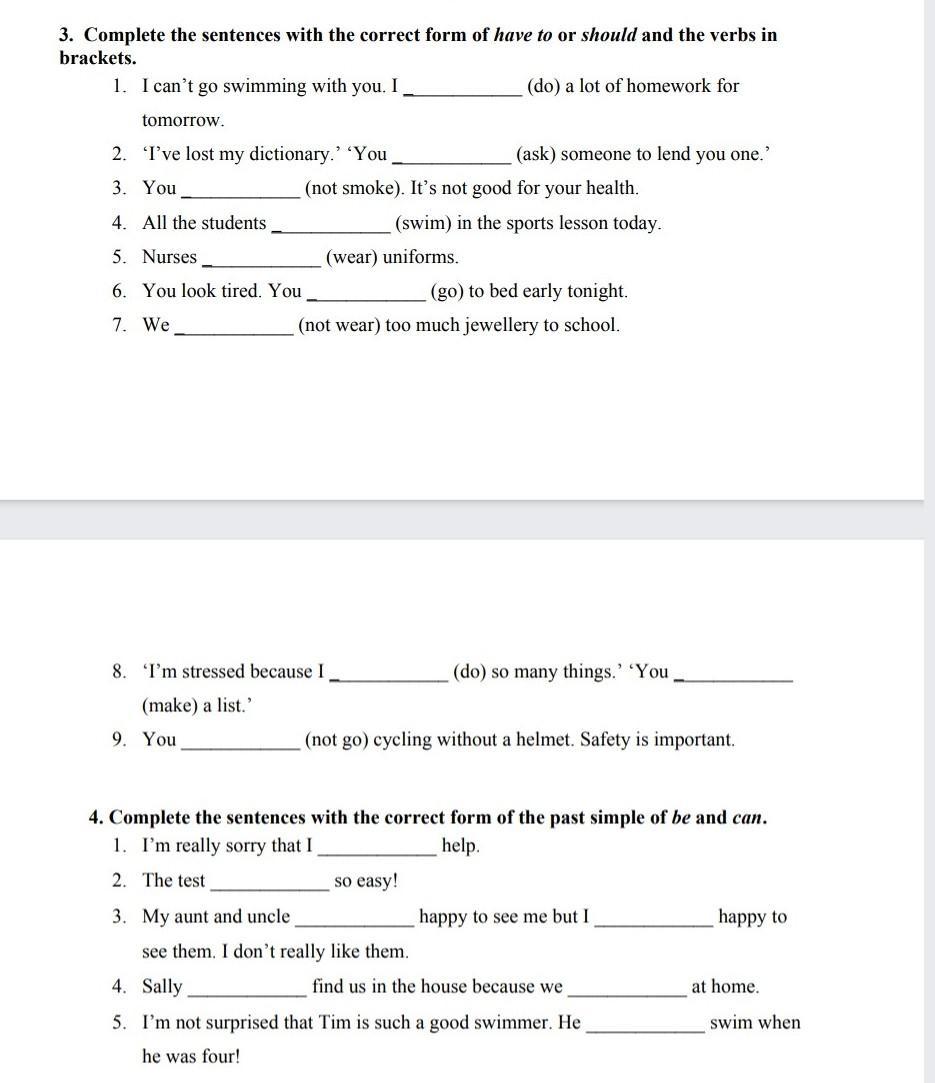 В 4 примере третьего задания - время выбирай в зависимости от того, как понимаешь предложение. То есть если урок уже прошел и студенты уже поплавали - то past (had), если им только предстоит поплавать - future (would have to).