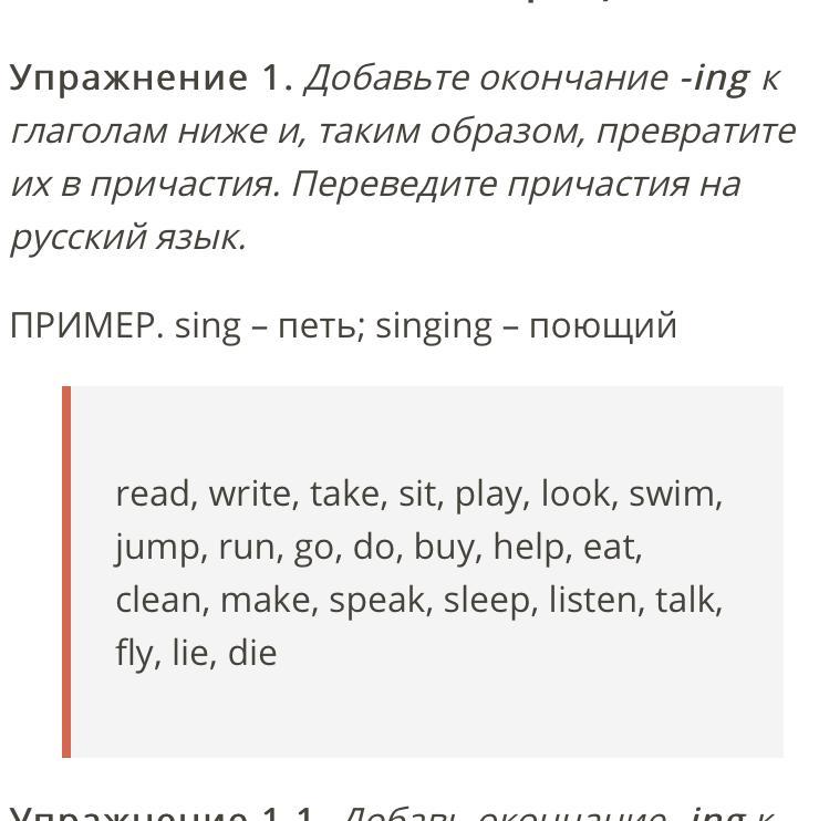 Reading, writing, taking, sitting, playing, looking, swimming, jumping, running, going, doing, buying, helping, eating, cleaning, making, speaking, sleeping, listening, talking, flying, lying, dying