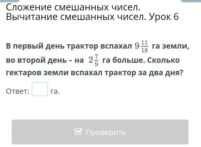 Приведем к общему знаменателю 173/18+50/18=223/18 или 12 7/18 га во второй день