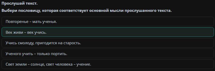Выбери пословицу, которая соответствует основной мысли прослушанного текста.