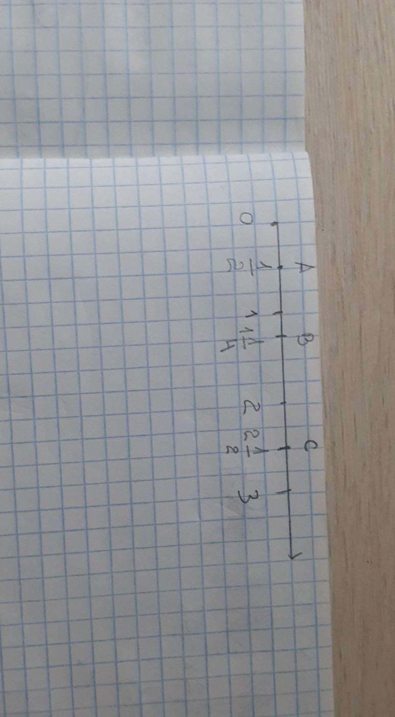 2. Начерти координатный луч. За единичный отрезок возьми 4 клетки. Отметь на луче точки А( 1/2 ), В( / ), С( / ).