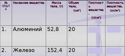 1. Заполните таблицу, вычислив плотность каждого цилиндра (вычисления запиши в тетради, используя формулу плотности) Чтобы найти плотность вещества используем формулу ρ=m/V ρ-плотность вещества, m-масса, V-объем тела. Чтобы г/см3 перевести в кг/м3