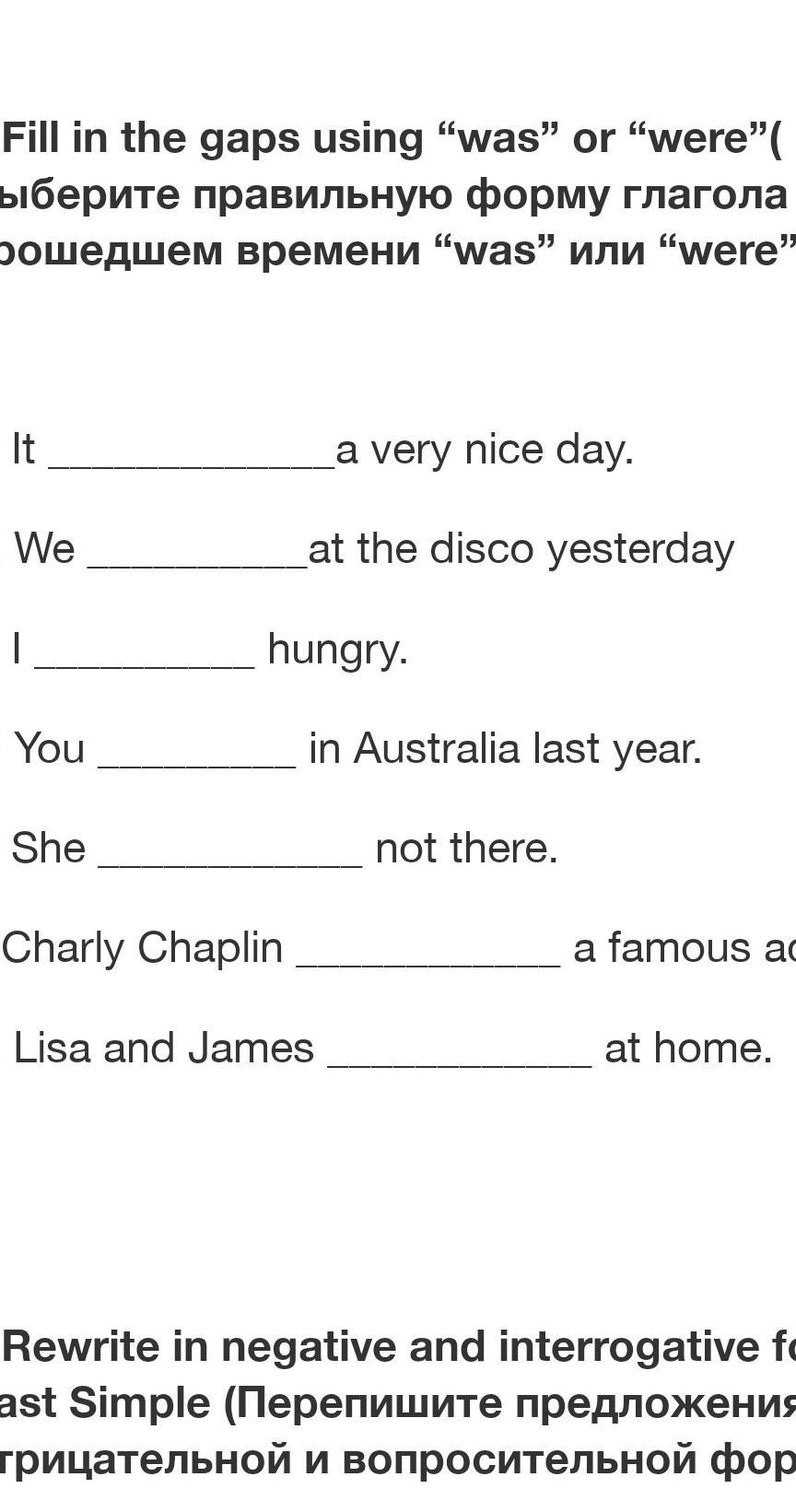1.Fill in the gaps using “was” or “were”( Выберите правильную форму глагола to be в прошедшем времени “was” или “were”)