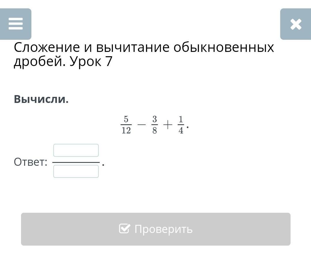 5/12 - 3/8 + 1/4 = 10/24 - 9/24 + 6/24 = 7/24