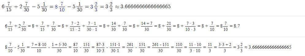 6 7/15 + 2 7/30 - 5 1/30 = 3 2/3