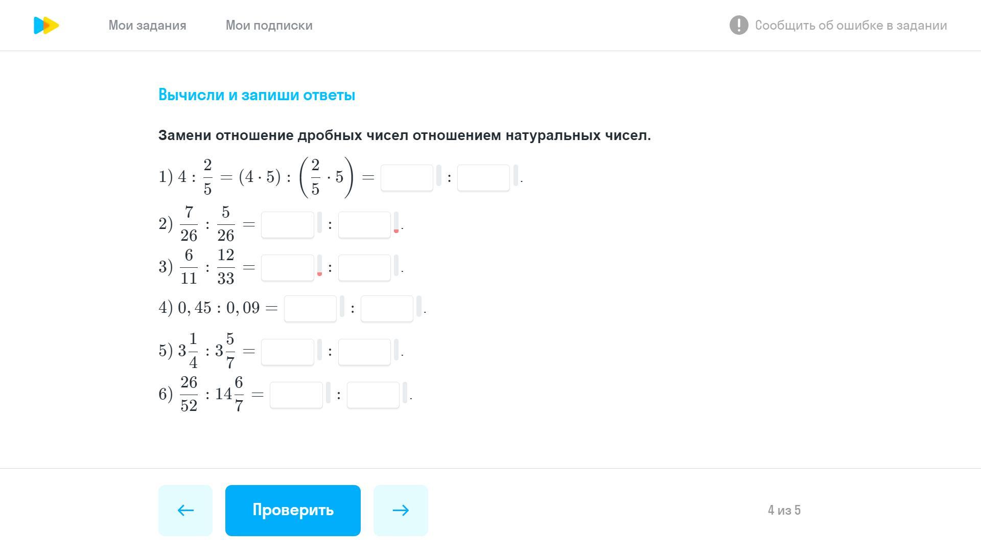 4) 0,45 : 0,09 = 9/20 : 9/100 = 9/20*100/9 = 5:1