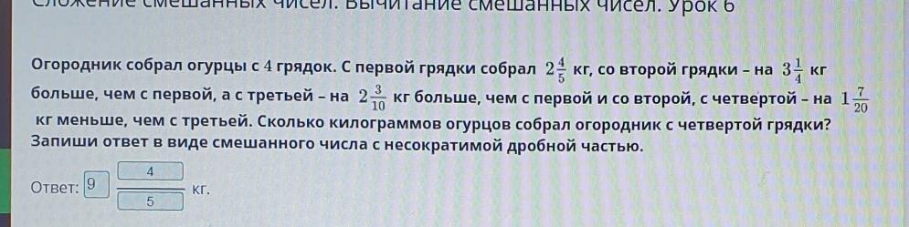 Огородник собрал огурцы с 4 грядок. С первой грядки собрал 2 кг, со второй грядки – на 34 кг
