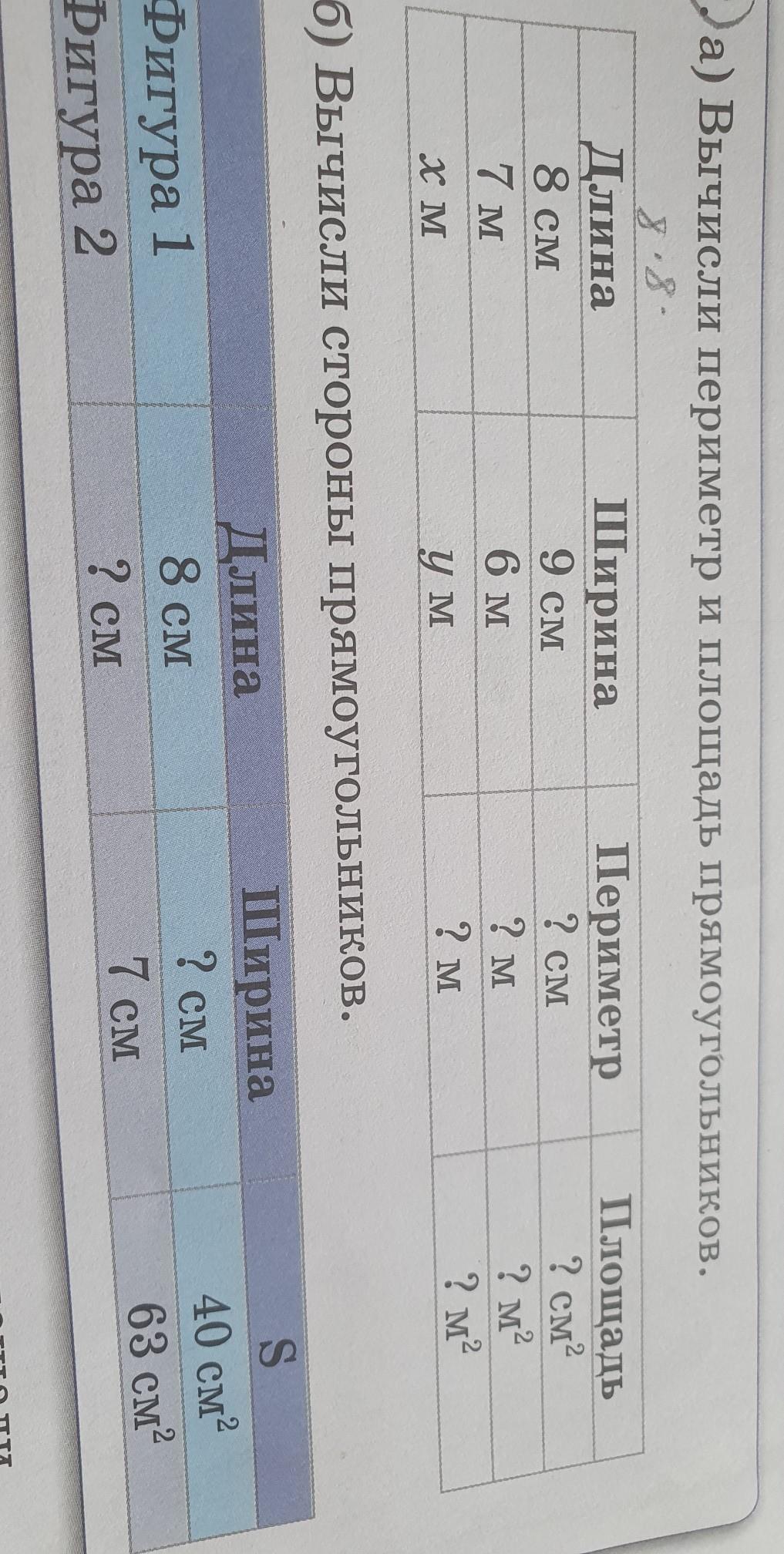 1) 8+9+8+9 = 34 см - периметр 8*9=63см в квадрате - площадь