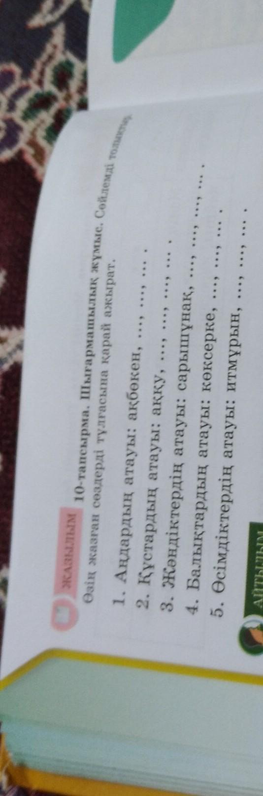 10-тапсырма.Шығармашылық жұмыс.Сөйлемді толықтыр.Өзің жазған сөздерді тұлғасына қарай ажырат